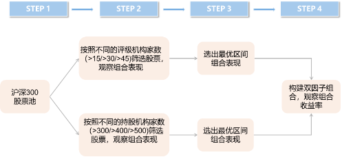 本文选取的评级机构家数为调仓日前180天内的评级机构家数,持股机构家数为调仓日前一个报告期半年报及年报的数据,下图为基于买卖方因子的组合筛选思路: