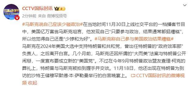 据@CCTV国际时讯 消息:当地时间11月30日上线社交平台的一档播客节目中建宝优配,美国亿万富翁马斯克坦言,他发现自己“只要参与政治,结果通常都挺糟糕”,所以他觉得自己还是“少掺和为好”。